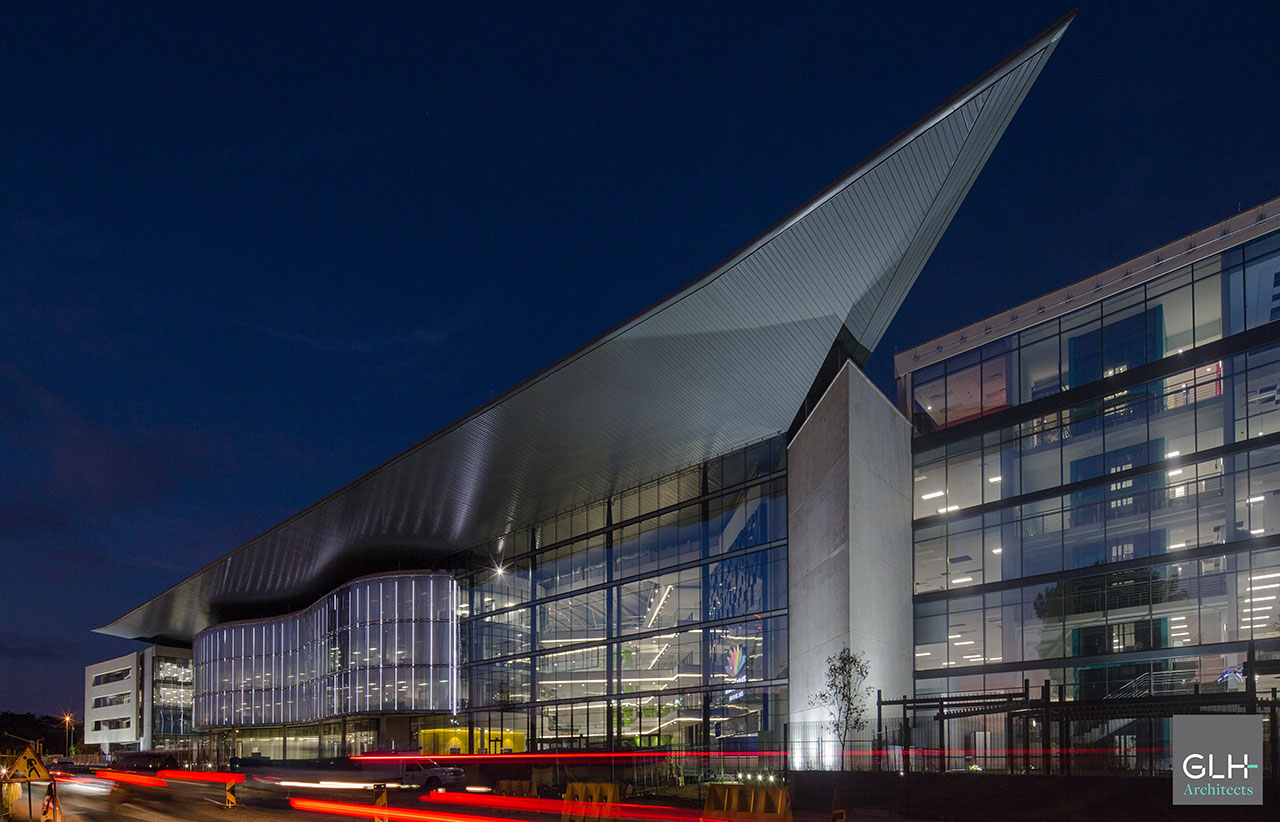 The RVI glass louvre solution shows vertical glass panels, spanning slab to slab and following the given curved shape of the façade. The 590mm wide laminated safety glass panels further show dotted ceramic frits. The 3500mm high louvres are segmented and grouped into defined control zones. In the closed position a pleasant and visually curved wave results following the façade contours. The building with a total of 35000 m^2 office space was awarded a 5-star V1 design certification in 2013 by the Green Building Council of South Africa. And with a 5-star V1 as-built certification recognized in 2016.